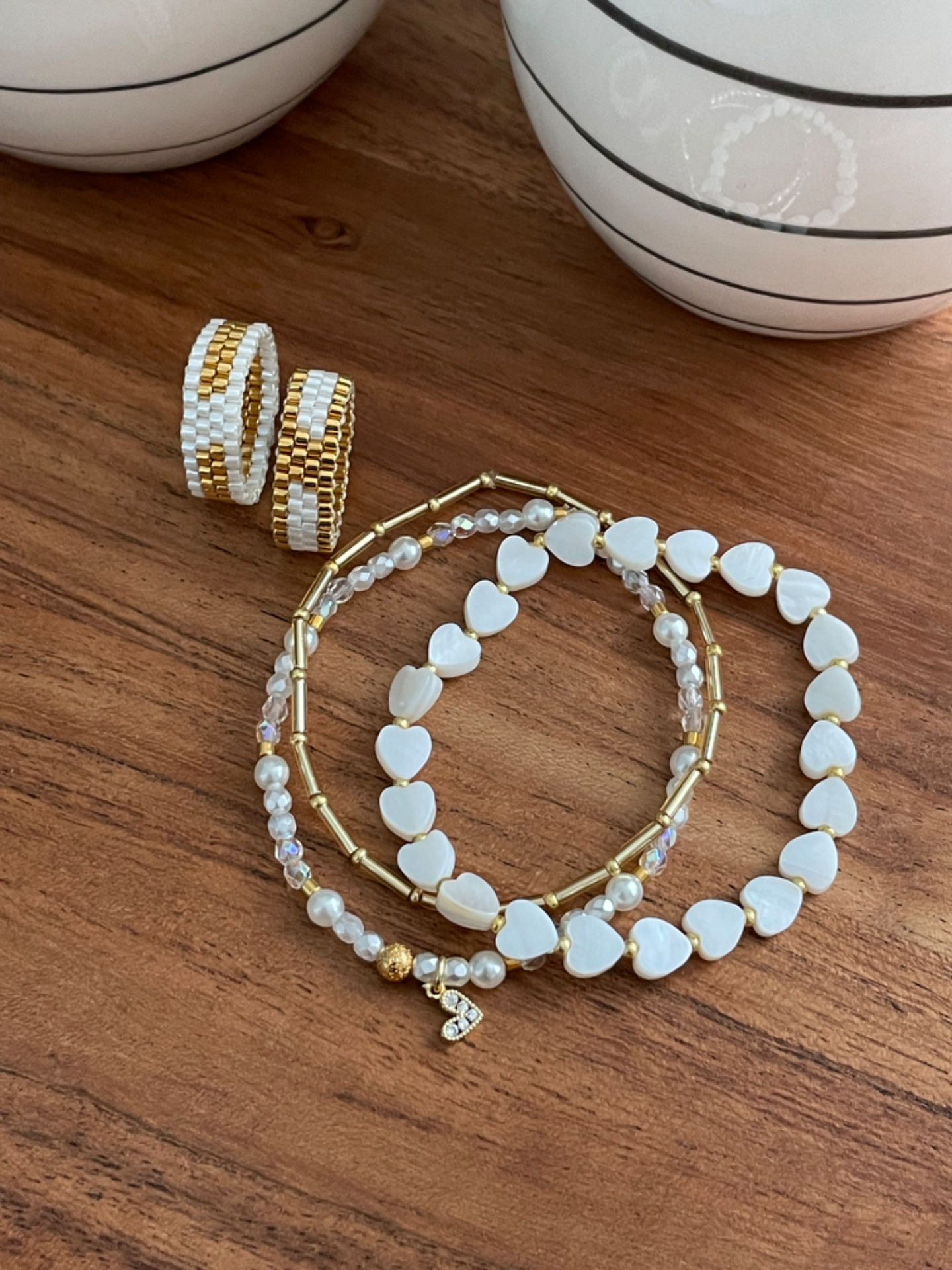 Letní set náramků v bílo-zlaté kombinaci z perliček a skleněných korálků. Prstýnek si vyberete podle sebe buď bílý nebo zlatý.